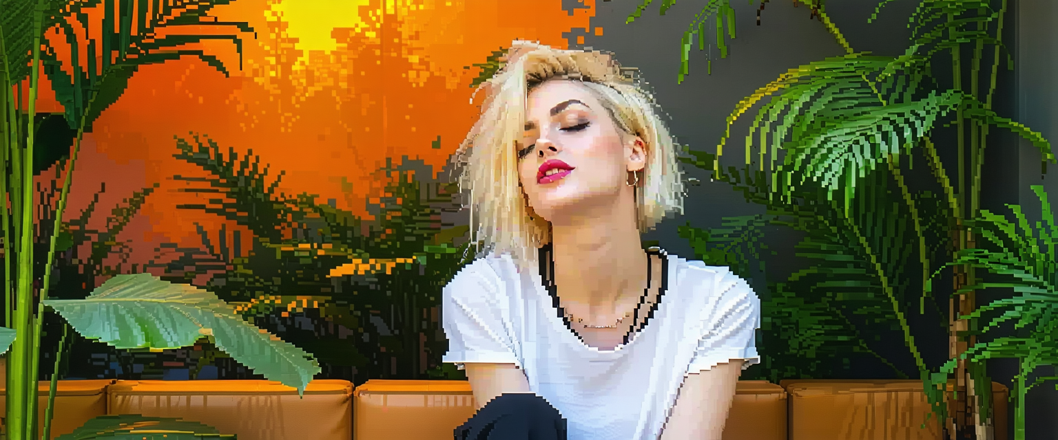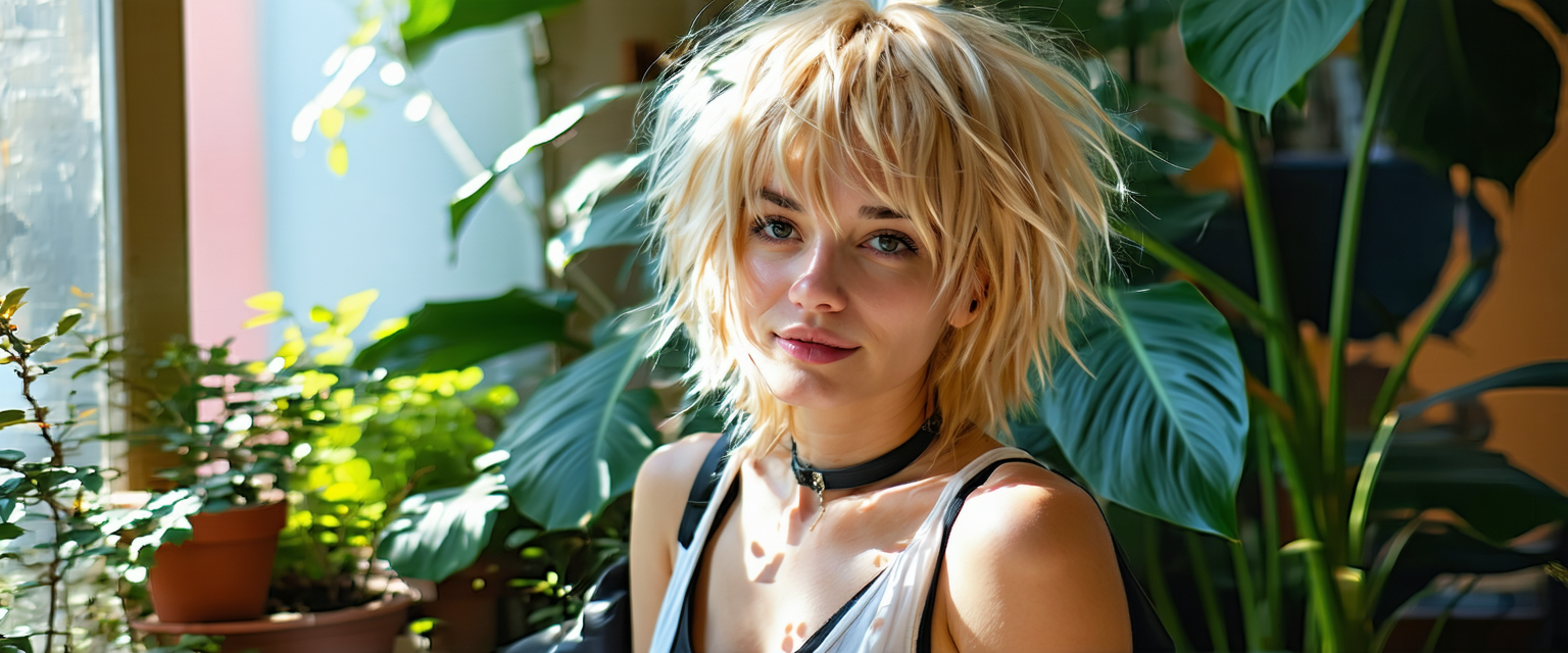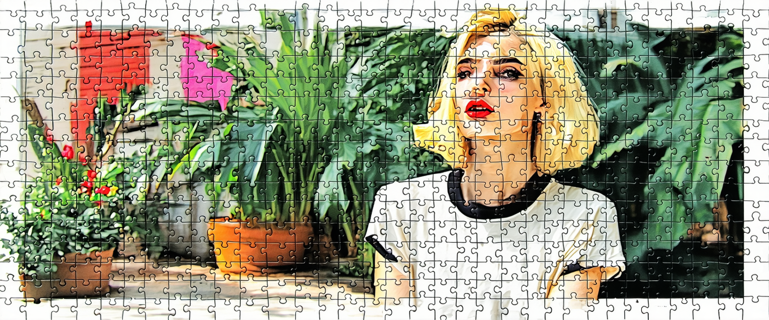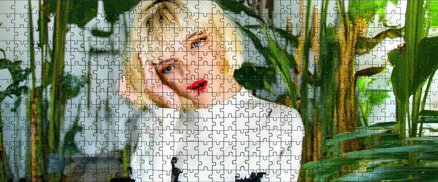 Generate a Ultra High Definition Jigsaw Puzzle as output. nature is used to accentuate the output. The Jigsaw Puzzle features a clear A stylish indoor scene featuring a person with blonde hair, displaying a playful pose with a subtle pout, set against a backdrop of vibrant tropical plants. The subject wears a white sleeveless top with black accents, showcasing a modern and casual fashion statement. The room is illuminated by soft, natural light that enhances the warm tones of the decor, creating a cheerful and relaxed atmosphere. Behind the subject, a mural of lush greenery adds depth and texture, while hints of furniture like a wooden cabinet and a glimpse of kitchen elements complete the cozy interior setting.. , wearing the fashion influence style Interactive garments. . The Lighting is CLOSE-UP PORTRAIT, the camera used was a GoPro HERO10 Black. The mood of the output compares to vivid marine life. Elements of Space scenes are visible. the Jigsaw Puzzle is further enhanced by using Landscape Photography. The Jigsaw Puzzle appears vivid marine life and CLOSE-UP PORTRAIT. Set the Aspect Ratio of the output to 2:3. If the output allows it, part of epidermal textures is visible. in the style of: cinematic
