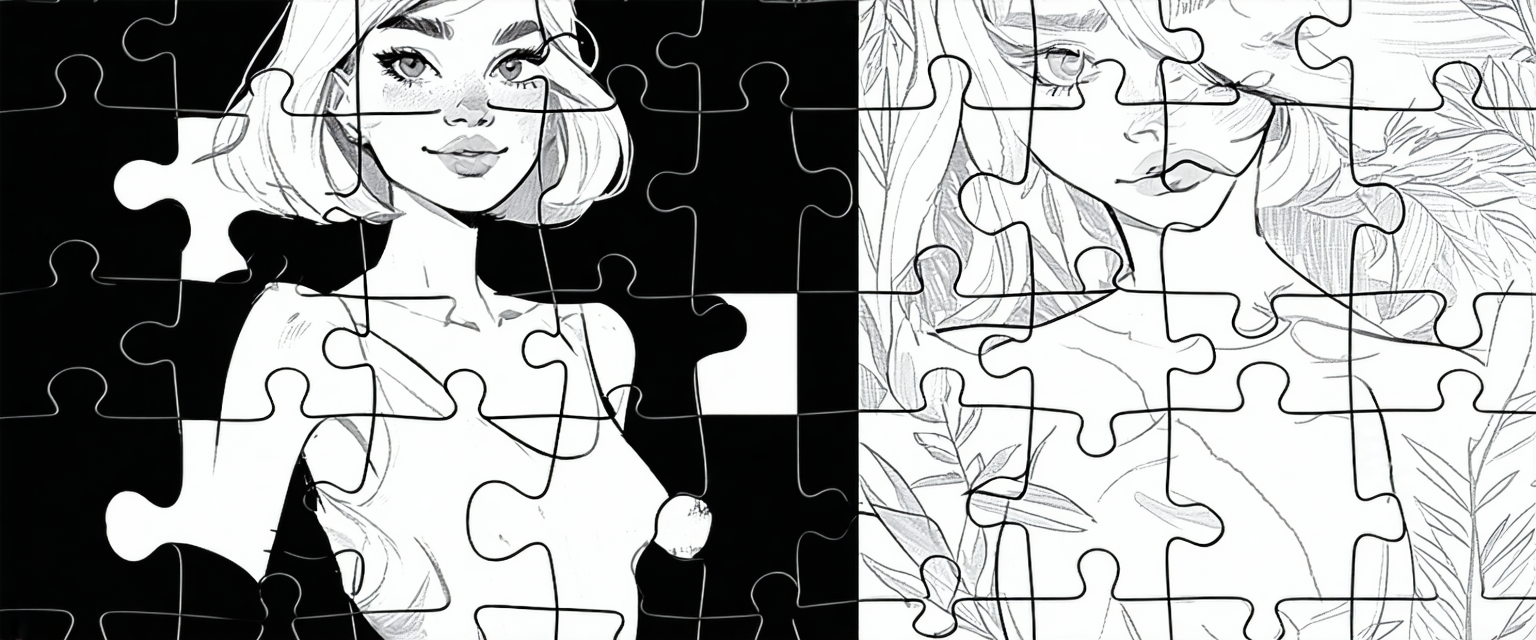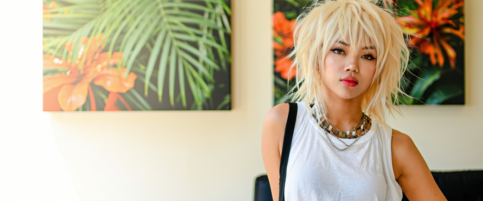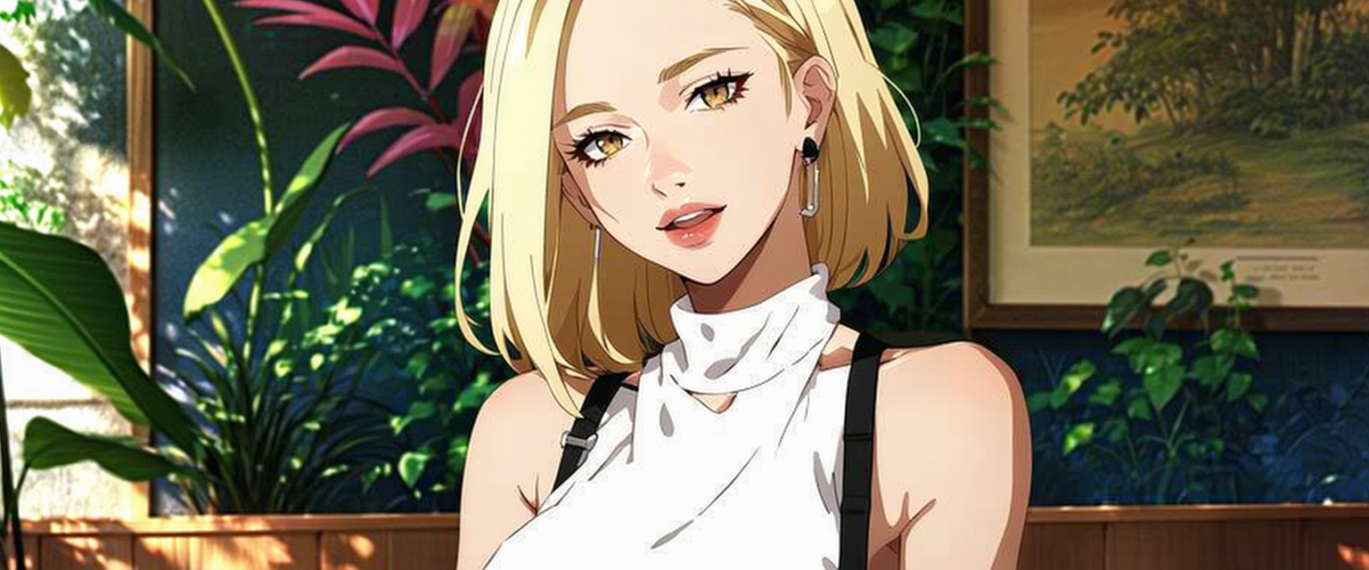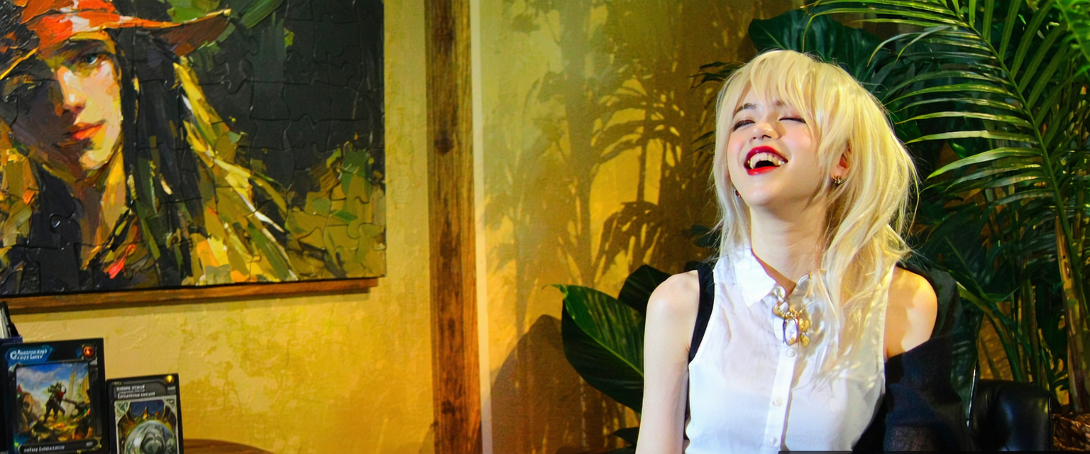 Generate a Ultra High Definition Jigsaw Puzzle as output. nature is used to accentuate the output. The Jigsaw Puzzle features a clear A stylish indoor scene featuring a person with blonde hair, displaying a playful pose with a subtle pout, set against a backdrop of vibrant tropical plants. The subject wears a white sleeveless top with black accents, showcasing a modern and casual fashion statement. The room is illuminated by soft, natural light that enhances the warm tones of the decor, creating a cheerful and relaxed atmosphere. Behind the subject, a mural of lush greenery adds depth and texture, while hints of furniture like a wooden cabinet and a glimpse of kitchen elements complete the cozy interior setting.. , wearing the fashion influence style Interactive garments. . The Lighting is CLOSE-UP PORTRAIT, the camera used was a GoPro HERO10 Black. The mood of the output compares to vivid marine life. Elements of Space scenes are visible. the Jigsaw Puzzle is further enhanced by using Landscape Photography. The Jigsaw Puzzle appears vivid marine life and CLOSE-UP PORTRAIT. Set the Aspect Ratio of the output to 2:3. If the output allows it, part of epidermal textures is visible. in the style of: cinematic